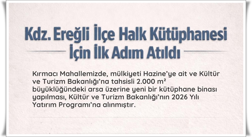 • AK Parti Zonguldak Milletvekili Saffet Bozkurt, Kdz. Ereğli’de yapılması planlanan İlçe Halk Kütüphanesi’nin 2026 Yılı Yatırım Programı’na alındığını açıkladı. Proje sürecinin başlatıldığı yatırımın 2027 yazında tamamlanması hedefleniyor.