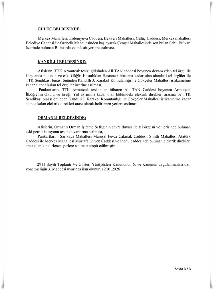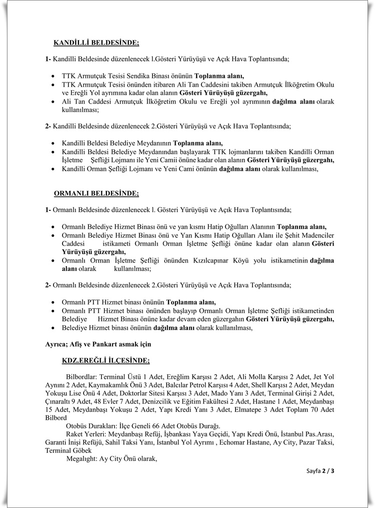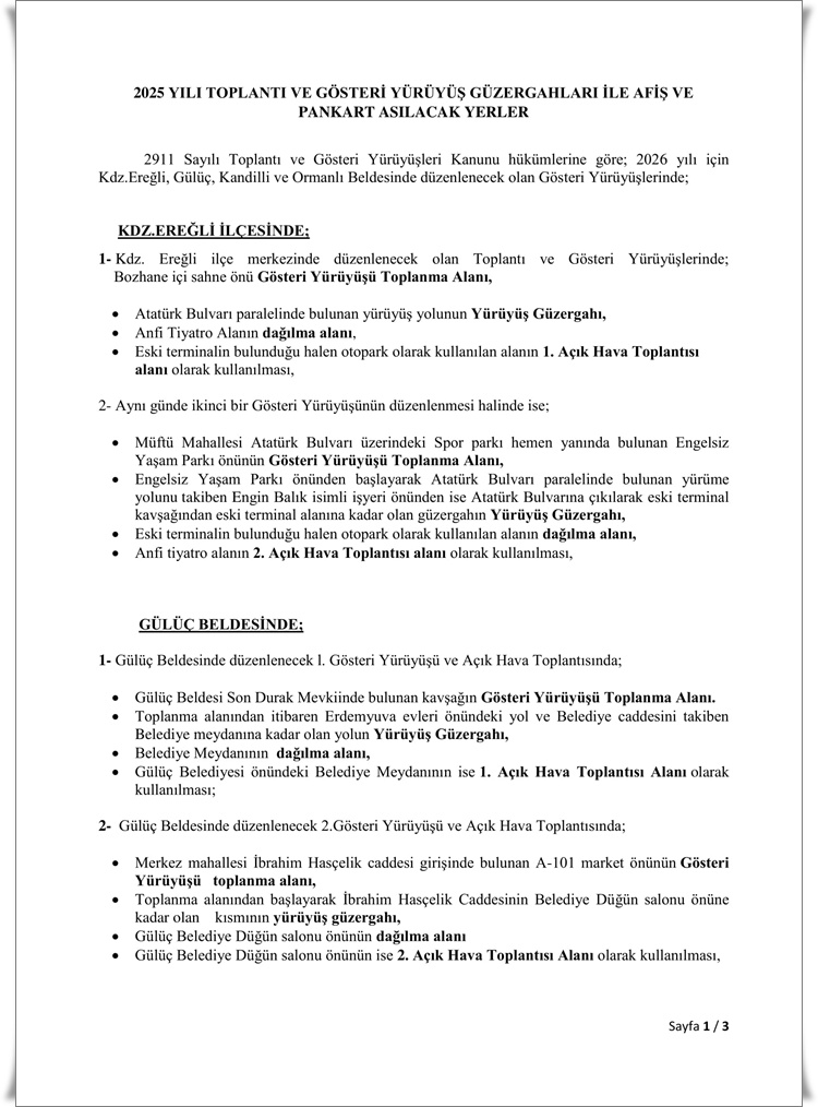Kdz. Ereğli Kaymakamlığı, 2026 yılı için Kdz. Ereğli ilçesinde, Gülüç, Kandilli ve Ormanlı Beldesinde yapılacak toplantı ve gösteri yürüyüşleri ile ilgili toplanma alanı, yürüyüş güzergahı, dağılma alanı ve açık hava toplantısı güzergah ve alanlarını açıkladı.