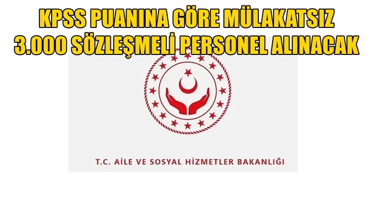 Aile ve Sosyal Hizmetler Bakanlığı Merkez ve Taşra Teşkilatında 657 sayılı Devlet Memurları Kanununun 4/B maddesi kapsamında çalıştırılmak üzere, 06.06.1978 tarihli ve 7/15754 sayılı Bakanlar Kurulu Kararı ile yürürlüğe konulan Sözleşmeli Personel Çalıştırılmasına İlişkin Esaslar’ın ek 2’nci maddesine göre, KPSS puan sıralaması esas alınmak suretiyle mülakatsız 3.000 sözleşmeli personel alınacak.