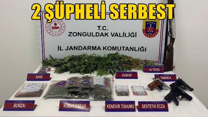 Arama sonucunda; (308) Gram kubar esrar, (35) Gram kenevir tohumu, (27) Gram bonzai, (14) Kök kenevir bitkisi, (6) Adet sentetik ecza hap, (2) Adet uyuşturucu madde kullanma aparatı, (2) Adet ruhsatsız tabanca, (1) Adet kuru sıkı tabanca, (18) Adet 9 mm tabanca fişeği, (15) Adet 9 mm kurusıkı tabanca fişeği, (16) Adet sikke, (1) Adet av tüfeği, (2) Adet cep telefonu ele geçirilerek 2 şüpheli şahıs yakalandı.