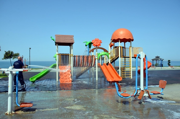 Alaplı’da parklar, çocuklar için hazırlanıyor. Alaplı Belediye Başkanı Nuri Tekin’in talimatları doğrultusunda harekete geçen ekipler, İlçede bulunan tüm parkları köpüklü su ile yıkama ve ardından dezenfekte çalışması yapıyor.