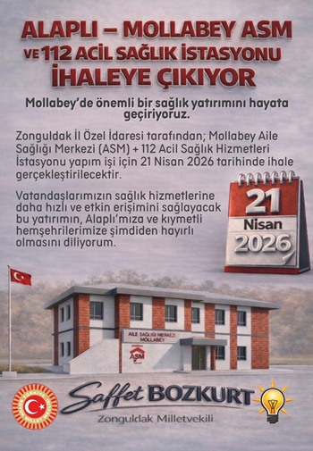 • AK Parti Zonguldak Milletvekili Saffet Bozkurt, Alaplı-Mollabey’de yapılması planlanan Aile Sağlığı Merkezi ve 112 Acil Sağlık Hizmetleri İstasyonu için ihale sürecinin 21 Nisan 2026’da başlatılacağını açıkladı.