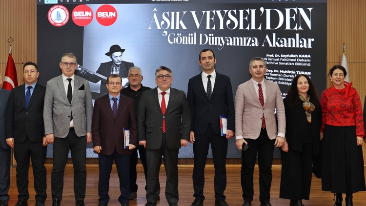 Doç. Dr. Turan’ın ardından söz alan Prof. Dr. Seyfullah Kara ise Âşık Veysel’i anlama çabasının kültürel süreklilik açısından büyük önem taşıdığını ifade ederek, ozanın zengin kültürel dünyasının kapsamlı şekilde analiz edilmesi gerektiğini belirtti. Konuşmaların ardından Prof. Dr. Seyfullah Kara, Âşık Veysel’in iki türküsünü saz eşliğinde icra ederek salona duygu dolu anlar yaşattı. Türkülerin ardından BEUN Rektörü Prof. Dr. Özölçer, programda sunum yapan akademisyenlere teşekkür belgelerini takdim etti. Program toplu hatıra fotoğrafı çekimiyle sona erdi.