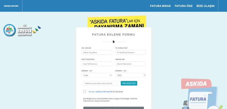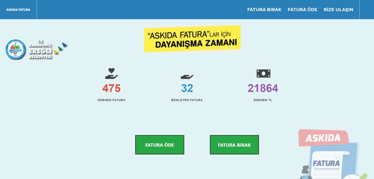 Faturalarını ödemede güçlük çeken vatandaşlar; belediyenin https://askidafatura.kdzeregli.bel.tr/ adresindeki “Fatura Bırak” bölümünden veya bizzat Çözüm Masası’na başvurarak destek alabiliyorlar.