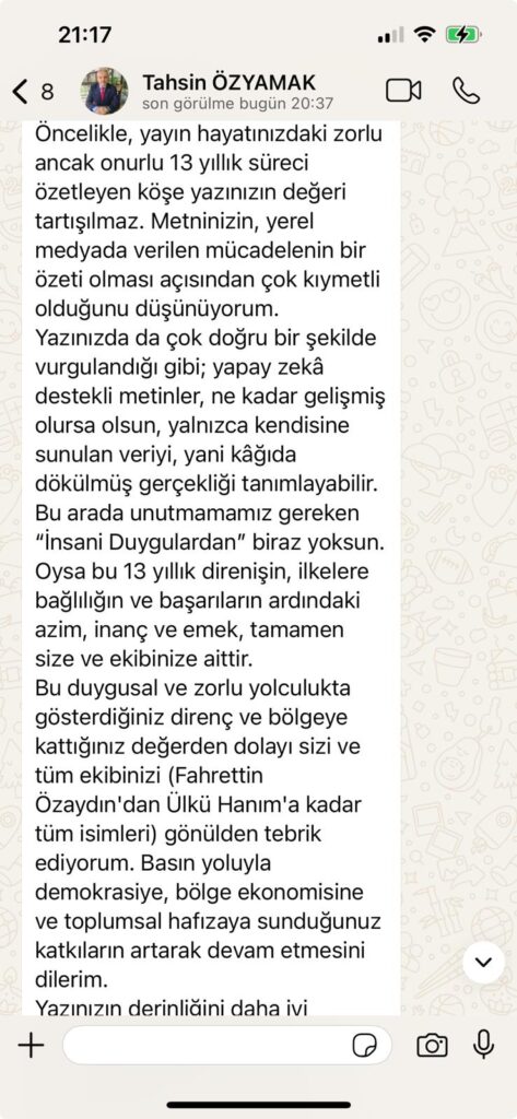 Bu duygusal ve zorlu yolculukta gösterdiğiniz direnç ve bölgeye kattığınız değerden dolayı sizi ve tüm ekibinizi (Fahrettin Özaydın’dan Ülkü Hanım’a kadar tüm isimleri) gönülden tebrik ediyorum. Basın yoluyla demokrasiye, bölge ekonomisine ve toplumsal hafızaya sunduğunuz katkıların artarak devam etmesini dilerim.