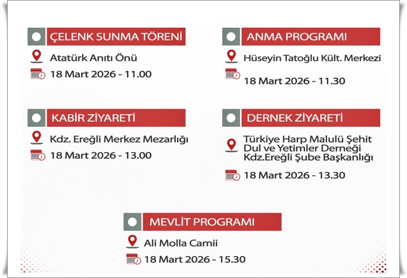 ’18 Mart Şehitler Günü’ nedeni ile Kdz. Ereğli’de düzenlenecek tören programları şöyle :