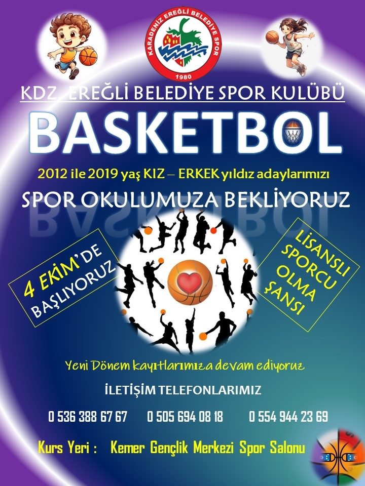 Kdz. Ereğli Belediyespor Kulübü, 2019 yılından beri tecrübeli eğitmenleri ile sürdürdüğü ve yıllardır büyük beğeni ve takdir toplayan kız – erkek olmak üzere basketbol branşında spor okulunu tekrar açıyor.