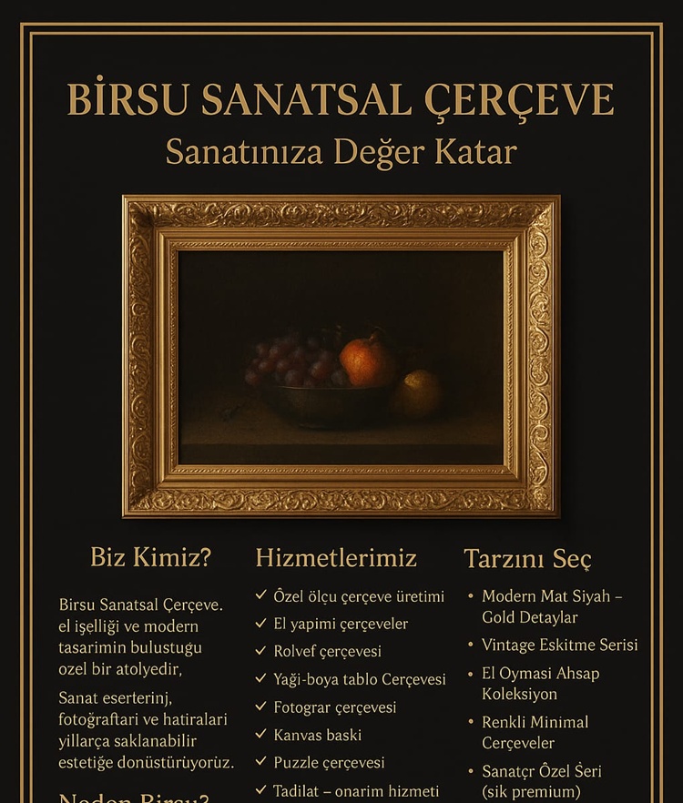 * Yağlıboya çerçeveleri: Tablonun karakterine göre seçilen klasik ve modern çerçeve uygulamaları