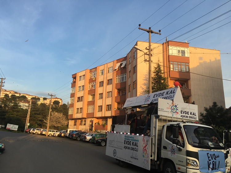 19 Nisan Pazar günü akşam saatlerinde Bağlık Mahallesinde duraklayan ekibe İsmail Mazlumcu sokak sakinlerinin pencere ve balkonlardan ilgisi yoğun oldu. Proje kapsamında, üzerinde Belediye Başkanı Halil Posbıyık imzalı ‘Evde Kal Aşkım Ereğli’ yazılı üstü açık araçta bulunan sanatçılar, halkı selamlayarak kurallara uyulmasını konusunda anonslar yaptılar. Canlı müzik eşliğinde coşkulu şarkılar söyleyen ve balkonlardan kendilerine eşlik eden halkın istek şarkılarına karşılık veren sanatçılar, zor günlerin geçeceğini hep birlikte eğleneceklerini söyleyerek alkış aldılar.