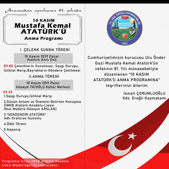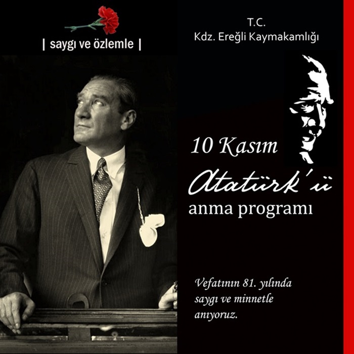 Kdz. Ereğli Kaymakamlığı tarafından 10 Kasım Mustafa Kemal Atatürk’ü anma programı düzenlenecek.