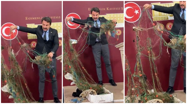 CHP Zonguldak Milletvekili Eylem Ertuğ Ertuğrul, TBMM’de yaptığı konuşmada Zonguldak’ın Kozlu ilçesi sahilinden getirdiği çöplere bulanmış balık ağlarıyla deniz ve çevre kirliliğine dikkat çekti.