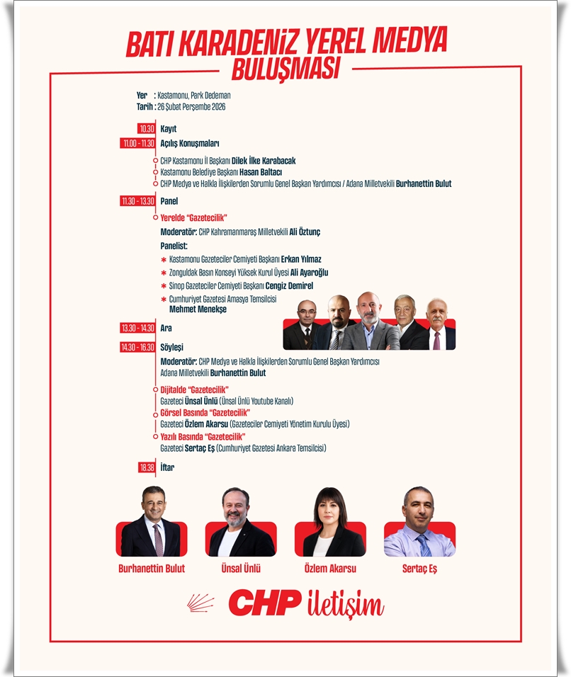 Batı Karadeniz Bölgesi’nde yerel medya temsilcilerini buluşturmayı amaçlayan “CHP Batı Karadeniz Yerel Medya Buluşması” programı 26 Şubat’ta Kastamonu’da gerçekleştirilecek.