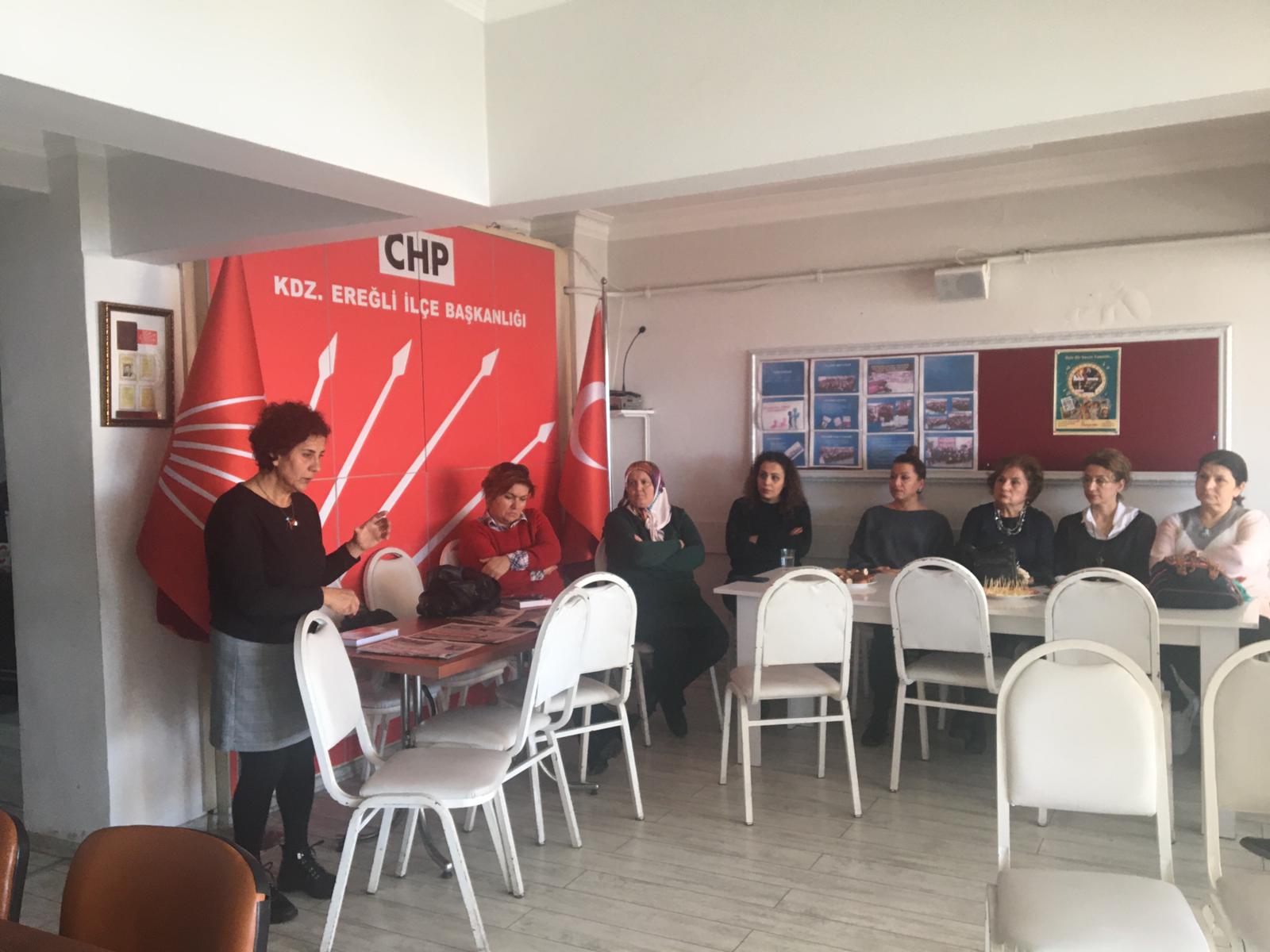 Zonguldak’ta 7 Mart 2020 tarihinde gerçekleştirilecek olan Cumhuriyet Halk Partisi Zonguldak İl Örgütü Kadın Kolu Genel Kurulu’nda Kdz. Ereğli İlçe Örgütü’nü temsilen oy kullanacak olan 68 kadın delege; 25 Şubat Salı günü parti binasında toplantı yaptı.