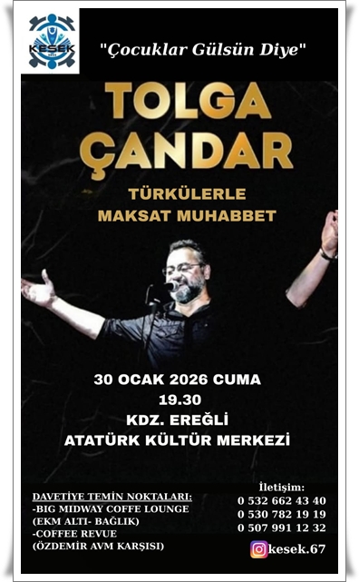 Türk halk müziğinin sevilen isimlerinden Tolga Çandar, “Türkülerle Maksat Muhabbet” başlıklı dinleti ve söyleşi programıyla Kdz. Ereğli’ye geliyor. Karadeniz Ereğli Sanat Eğitim Kültür ve Sosyal Yardımlaşma Derneği (KESEK) Organizasyonuyla, “Çocuklar Gülsün Diye” mottosuyla düzenlenen etkinlik, 30 Ocak 2026 Cuma günü saat 19.30’da Kdz. Ereğli Atatürk Kültür Merkezi’nde gerçekleştirilecek.