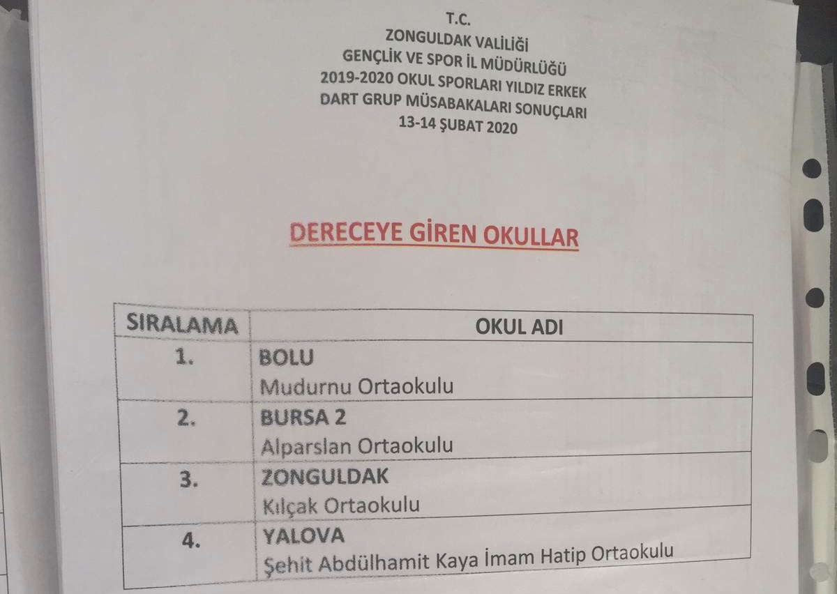 Kdz. Ereğli’de düzenlenen okul sporları Dart Grup Müsabakaları sonuçları belli oldu.