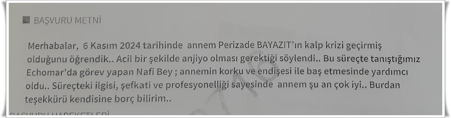 Merhabalar, 6 Kasım 2024 tarihinde annem Periz de Beyazıt’ın kalp krizi geçirmiş olduğunu öğrendik. Acil bir şekilde anjiyo olması gerektiği söylendi. Bu süreçte tanıştığımız Echomar‘da görev yapan Nafi Bey; annemin korku ve endişesi ile baş etmesinde yardımcı oldu. Süreçte ilgisi, şefkati ve profesyonelliği sayesinde annem şu an çok iyi. Buradan kendisine teşekkürü borç bilirim.