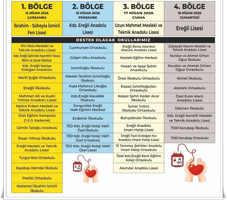 Türk Kızılay’ın Ereğli’de hayata geçirdiği bu anlamlı organizasyon, eğitim camiasının toplumsal dayanışmadaki rolünü bir kez daha ortaya koyarken, vatandaşlar da belirtilen okullara giderek gönüllü olarak kan bağışında bulunabilecek.