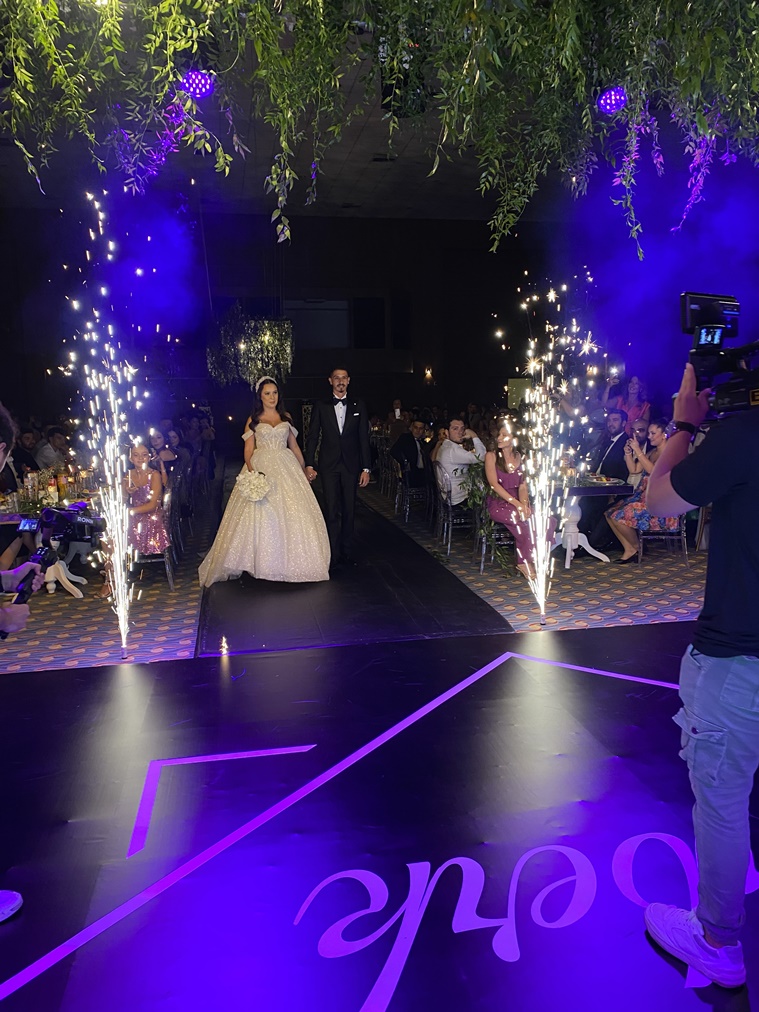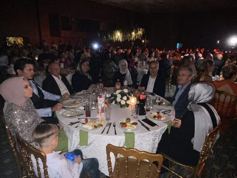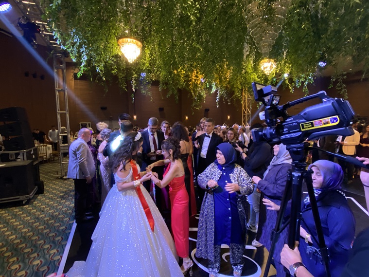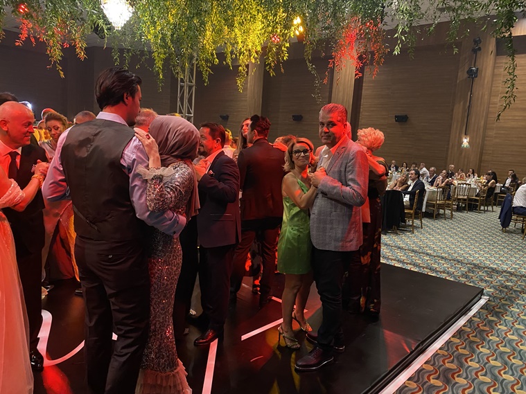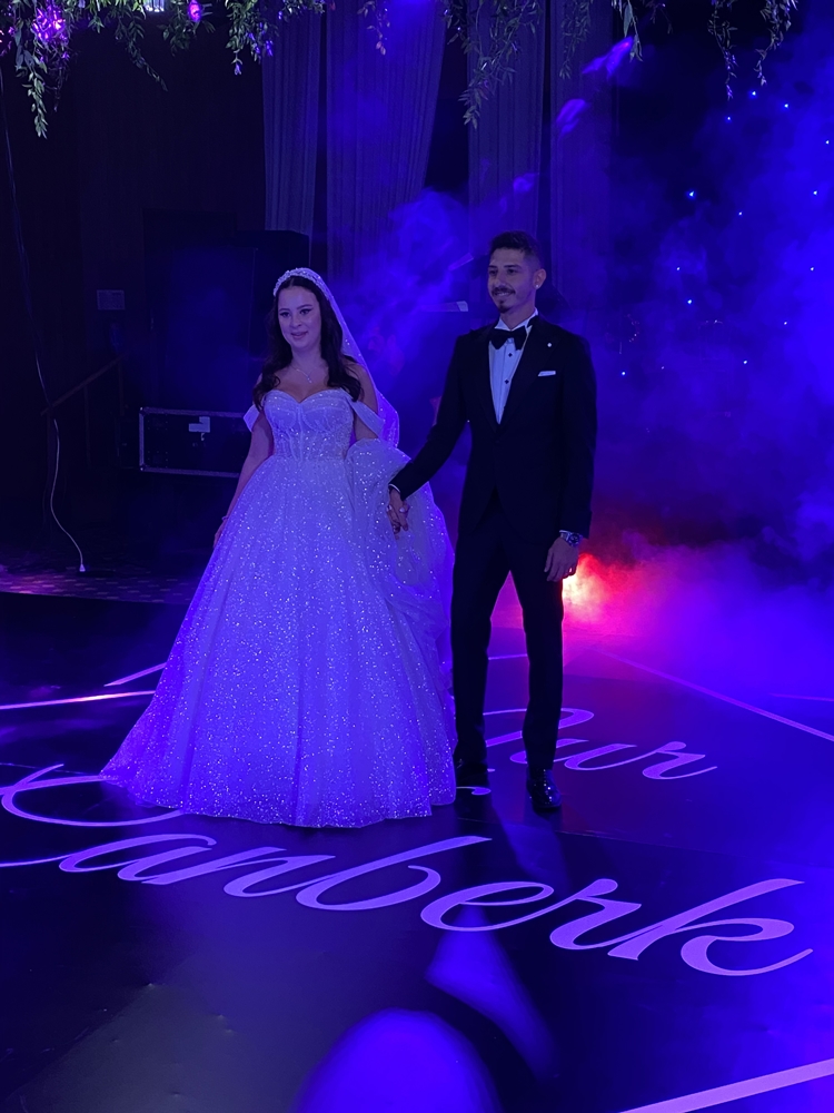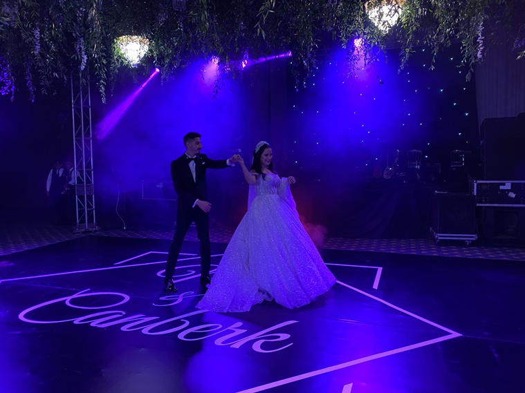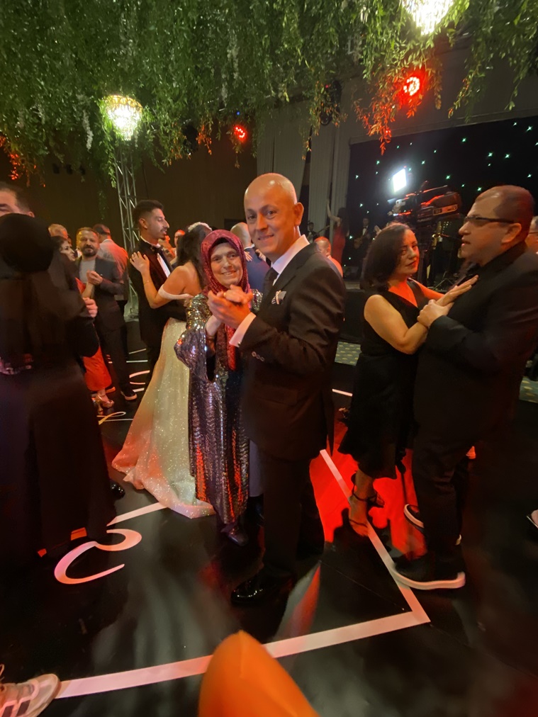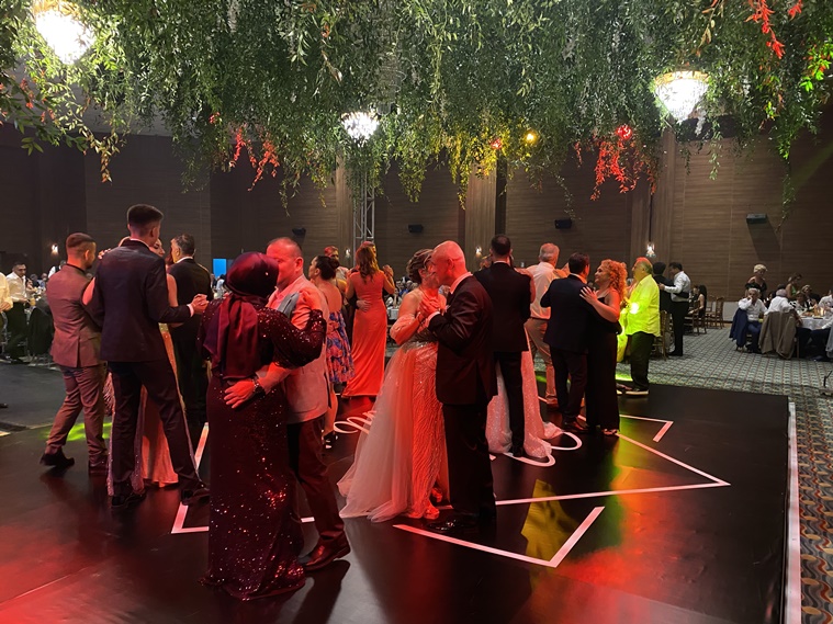 Özel süslemeli salona müzik eşliğinde el ele giren çift ilk dansı yaptı. Safa orkestrası eşliğinde davetlilerin de çifte eşlik etmesi ile eğlence devam ederken genç çiftin aile yakınlarının mutlulukları gözden kaçmadı.