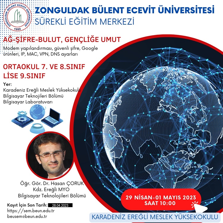 “Ağ-Şifre-Bulut, Gençliğe Umut temalı Kursa 7, 8 ve 9. sınıf öğrencileri katılabilecek. 29-30 Nisan ve 1 Mayıs tarihleri arasında 3 gün gerçekleşmesi planlanan kursun içeriğinin yer aldığı bilgi formu ve ön kayıt formu; https://sem.beun.edu.tr/duyurular/agsifrebulut-genclige-umut-egitimi.html linkinde yer alıyor.