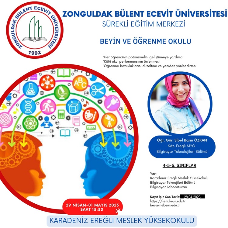 ‘Beyin ve Öğrenme Okulu Eğitimi’ temalı ikinci kursumuza ise 4, 5 ve 6. sınıf öğrencileri katılabilecek. Aynı şekilde 29-30 Nisan ve 1 Mayıs tarihleri arasında 3 gün gerçekleşmesi planlanan kursun içeriğine ilişkin bilgi formu ve ön kayıt formu da, https://sem.beun.edu.tr/duyurular/beyin-ve-ogrenme-okulu-egitimi-baslangic-29-nisan-2023.html linkinden temin edilebilecek.