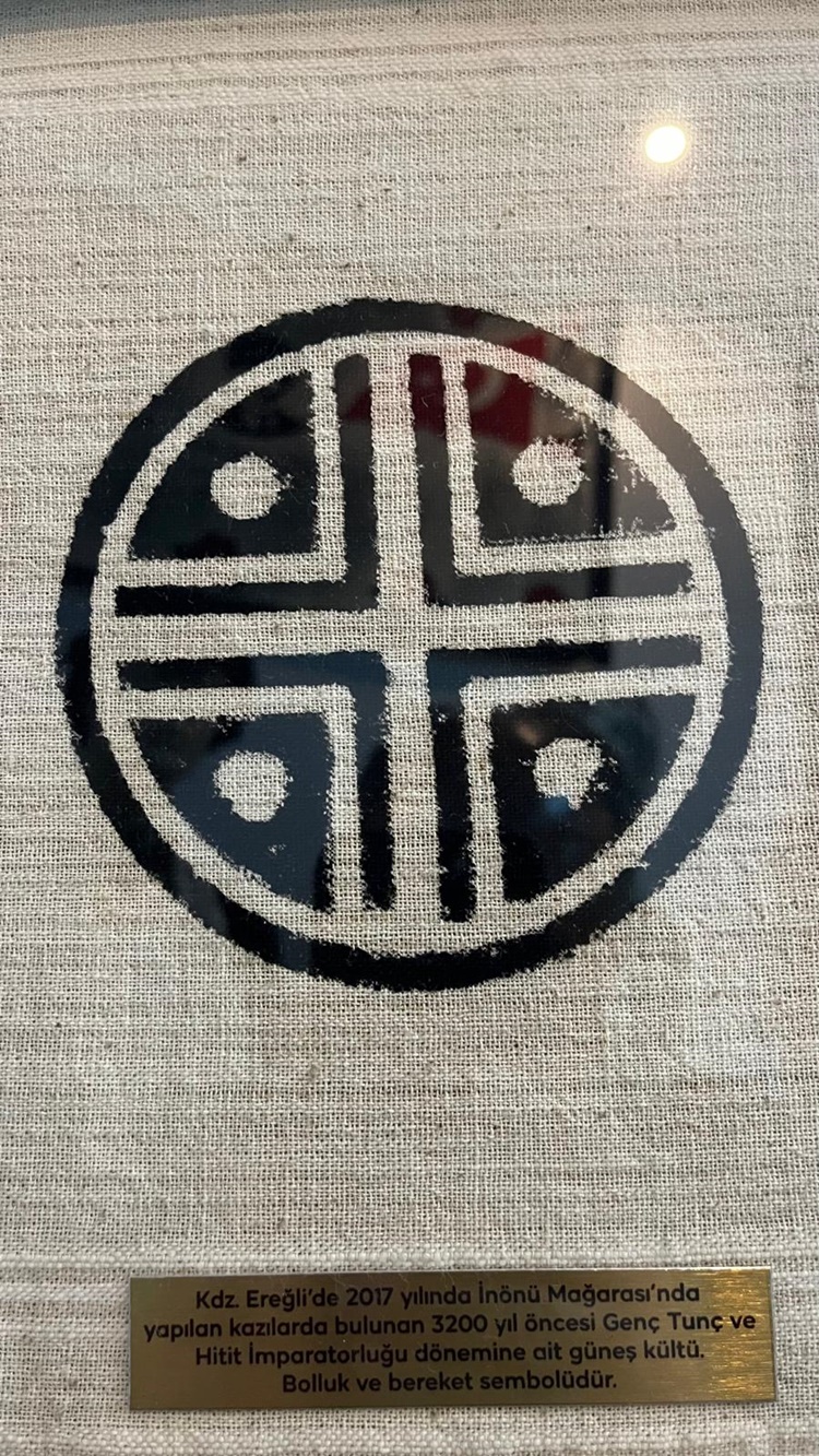 “Kdz. Ereğli’de 2017 yılında İnönü Mağarası’nda yapılan kazılarda bulunan 3200 yıl öncesi Genç Tunç ve Hitit İmparatorluğu dönemine ait güneş kültü. Bolluk ve bereket sembolüdür.”