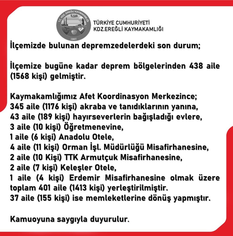 Kdz. Ereğli Kaymakamlığından edinilen bilgiye göre; Kahramanmaraş merkezli depremde mağdur olan 438 aileden 1568 kişi Karadeniz Ereğli’ye geldi. Tanıdıkların yanlarına, çeşitli misafirhanelere ve otellere yerleştirilen ailelerden 37 aile ve 155 kişi ise memleketlerine dönüş yaptı. Buna göre gelenlerin yaklaşık yüzde 90’ı Ereğli’ye yerleşti, yüzde 10’u ise memleketlerine dönüş yaptı.