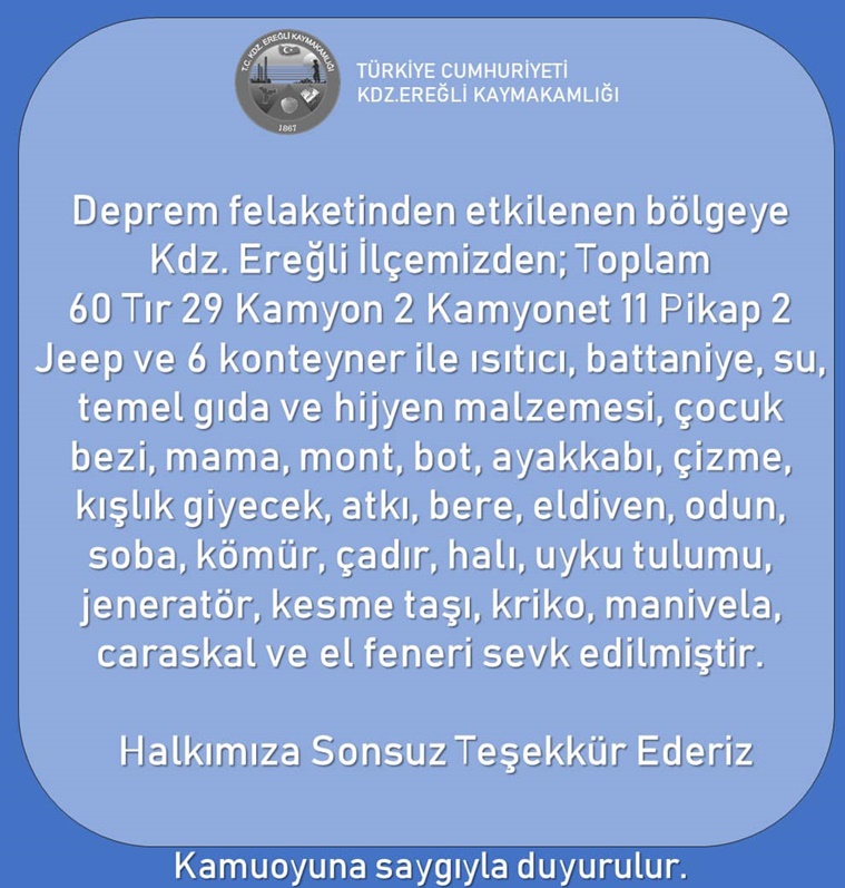 Öte yandan depremin meydana geldiği 6 Şubat’tan bu yana Kdz. Ereğli’den toplam 60 tır, 29 kamyon, 2 kamyonet, 11 pikap, 2 jeep ve 6 konteynır dolusu ihtiyaç malzemesi gönderildi.