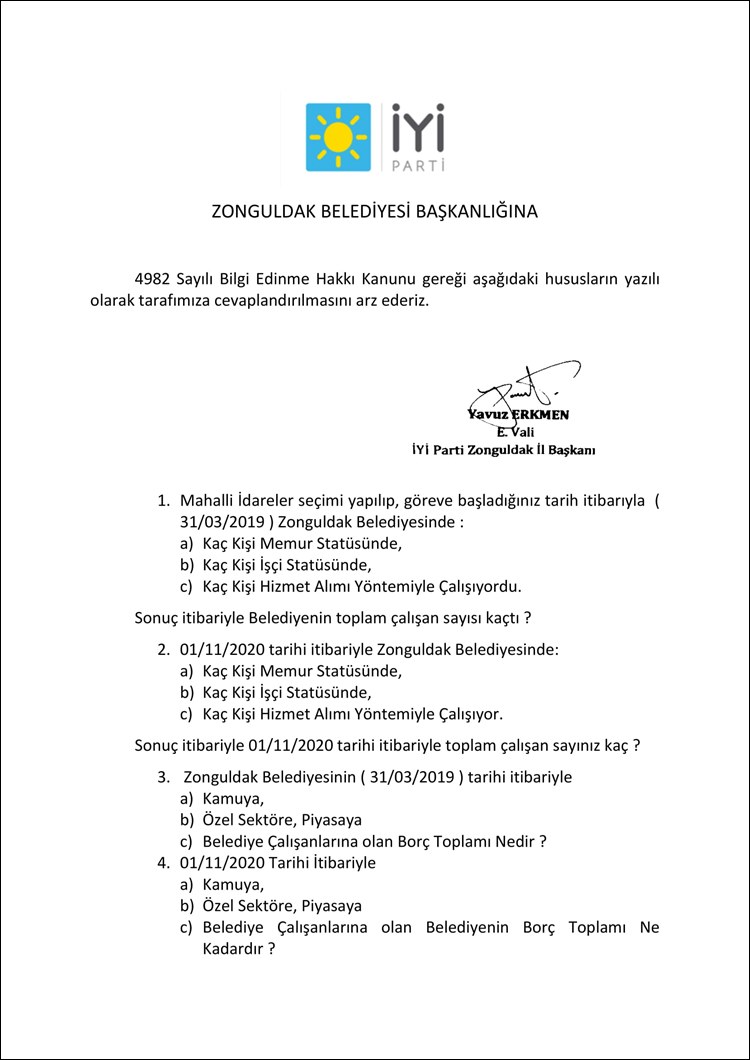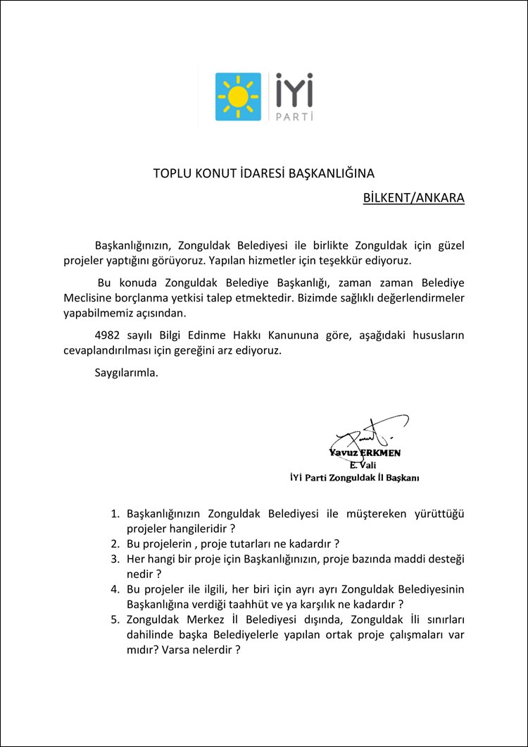 Erkmen, Bilgi Edinme Kanununa göre Kamu Kurum ve Kuruluşları kendilerine sorulan soruları, yine aynı kanun gereği 15 gün içinde cevaplamak zorunda olduklarını hatırlatarak, “Cevap vermeyerek görevini ihmal eden Belediye Başkan ve görevlileri ile yine aynı şekilde sorduğumuz sorulara cevap vermeyen TOKİ yetkilileri hakkında aynı kanun gereği idari ve cezai işlem yapılmak üzere Zonguldak Valilik Makamına ve Zonguldak Cumhuriyet Başsavcılığına suç duyurusunda bulunduk.” ifadelerini kullandı.