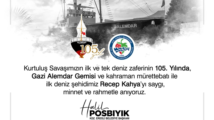 Kdz. Ereğli Belediye Başkanı Halil Posbıyık, Kurtuluş Savaşımızın ilk ve tek deniz zaferinin 105. yılında, Gazi Alemdar Gemisi ve kahraman mürettebatı ile ilk deniz şehidimiz Recep Kahya’nın minnet ve rahmetle alınacağı açıkladı.