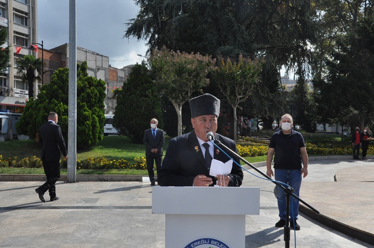 Tören, protokol sırasına göre çelenklerin Atatürk Anıtına sunulması ile başladı. Saygı duruşunda bulunulması, İstiklal Marşının ilk defasında kayıttan yarından başlaması nedeni Kaymakam Yapıcının uyarıyla ikinci kez söylenmesi ve bayrakların göndere çekilmesinin ardından Türkiye Muharip Gaziler Derneği Kdz. Ereğli Şube Başkanı Temel Şahin günün anlam ve önemini belirten konuşmasını yaptı. Konuşmasının bir bölümünde “Üzerinde yaşadığımız toprakların bizler için vatana dönüşmesi, bayrağımızın özgürce dalgalanması, şehitlerimizin ve gazilerimizin emsalsiz fedakarlıklarının eseridir.” diyen Şahin, milli ve manevi değerlere dikkat çekerek gazilik ve şehitliğin vatanın savunulmasındaki önemine vurgu yaptı.