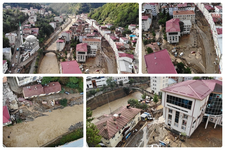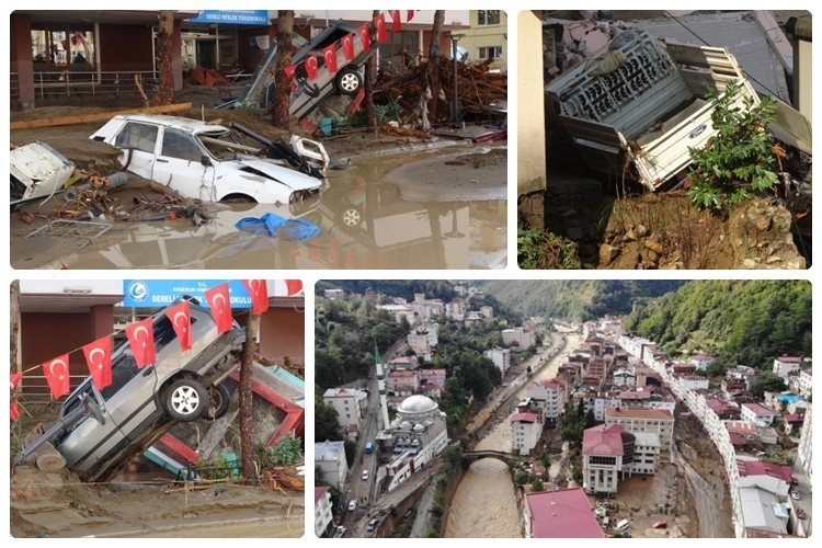 Giresun’u etkisi altına alan sağanak yağış şehrin birçok yerinde su baskınlarına ve tahribata yol açtı. Dereli ilçesinde dün saat 15.00 sıralarında başlayan sağanak yağış, akşam saatlerinde dere taşkınlarına ve su baskınlarına neden oldu. İlçe merkezi yakınlarından geçen Aksu Deresi’nin taşmasıyla cadde ve sokaklar adeta nehre döndü. Taşkının şiddetinin artması nedeniyle yol kenarlarında park halindeki araçlar sele kapıldı. İşyerlerinde yaklaşık 2 metreye kadar su baskınları yaşandı. Gece boyunca selin etkili olduğu ilçede gün ağarınca selin geriye bıraktığı moloz, taş, odun ve sürüklediği araçlar ile balçık kaldı. Milyonlarca lira zararın olduğu ilçe adeta balçık tarlasına dönerken, o anlar havadan görüntülendi.