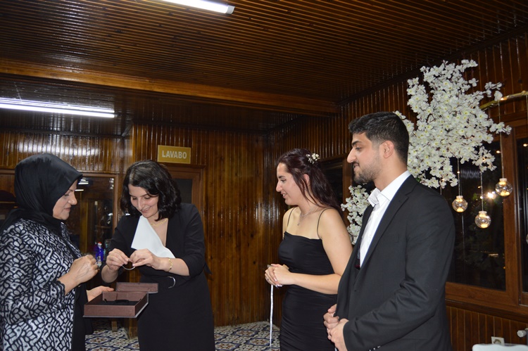 Güleryüzleri ve sempatik tavırları ile aile büyüklerinin elini öpen genç nişanlılar, takıları ve tebrikleri kabul ederek bol bol hatıra fotoğrafı çektirdi. Bu sırada Binnur Gönüllü’nün duygulandığı gözlerden kaçmadı.