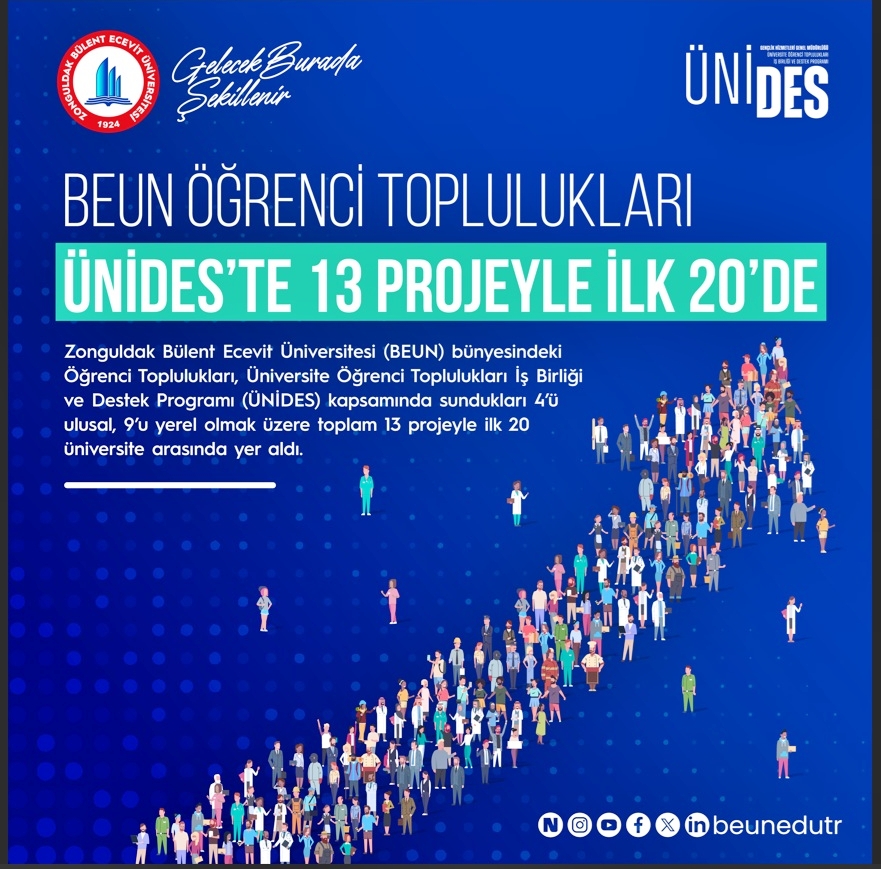 Zonguldak Bülent Ecevit Üniversitesi (BEUN) bünyesinde faaliyet gösteren öğrenci toplulukları, Öğrenci Toplulukları İş Birliği ve Destek Programı (ÜNİDES) kapsamında sundukları projelerle önemli bir başarıya imza attı. BEUN öğrenci toplulukları, destek almaya hak kazandıkları 4’ü ulusal, 9’u yerel olmak üzere toplam 13 proje ile Türkiye genelinde ilk 20 üniversite arasında yer aldı.
