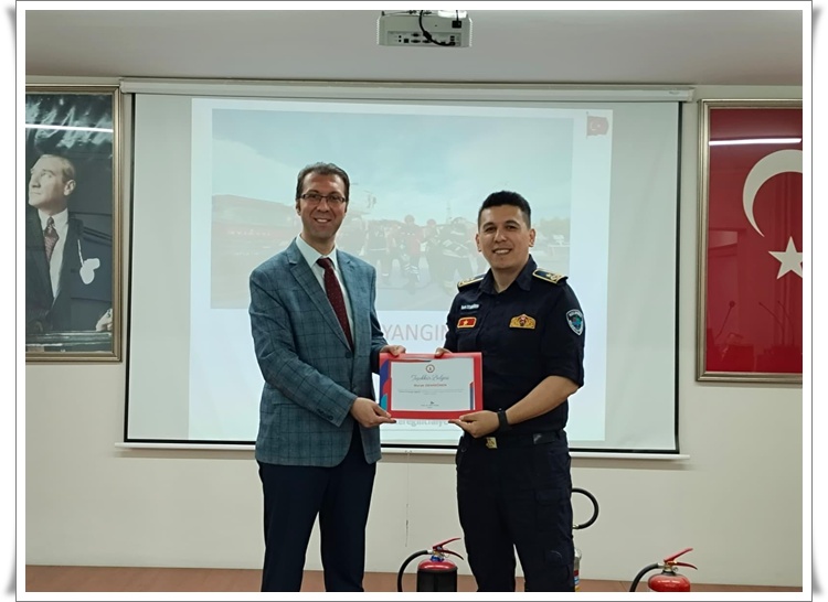 Turizm Fakültesi Dekanı Prof. Dr. Avni Yıldız, eğitimi veren İtfaiye Amiri Burak Demirören’e teşekkür belgesi takdim etti.