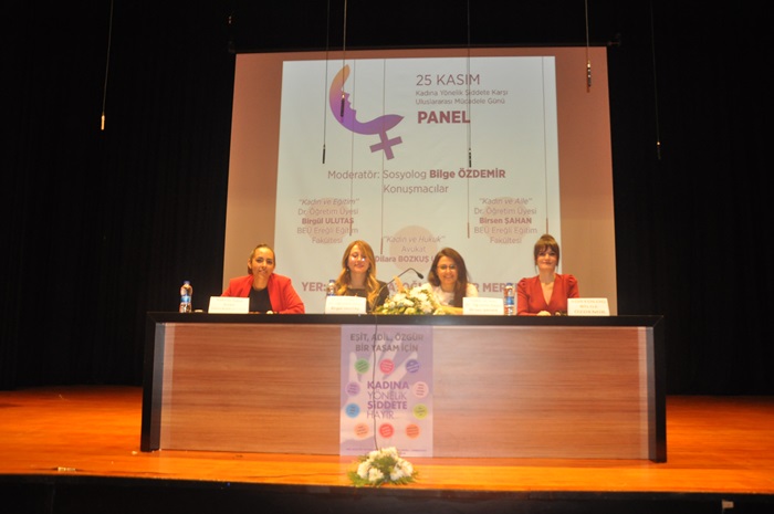 25 Kasım Pazartesi günü Hüseyin Tatoğlu Kültür Merkezinde düzenlenen ve Sosyolog Bilge Özdemir’in moderatörlüğünü yaptığı panelde ; ‘BEÜ Ereğli Eğitim Fakültesi Dr. Öğretim Üyeleri Birgül Ulutaş; “Kadın ve Eğitim”, Dr. Birsen Şahan; “Kadın ve Aile” ve Avukat Dilara Bozkuş Uzun; “Kadın ve Hukuk” konularında sunumlarını yaptılar.