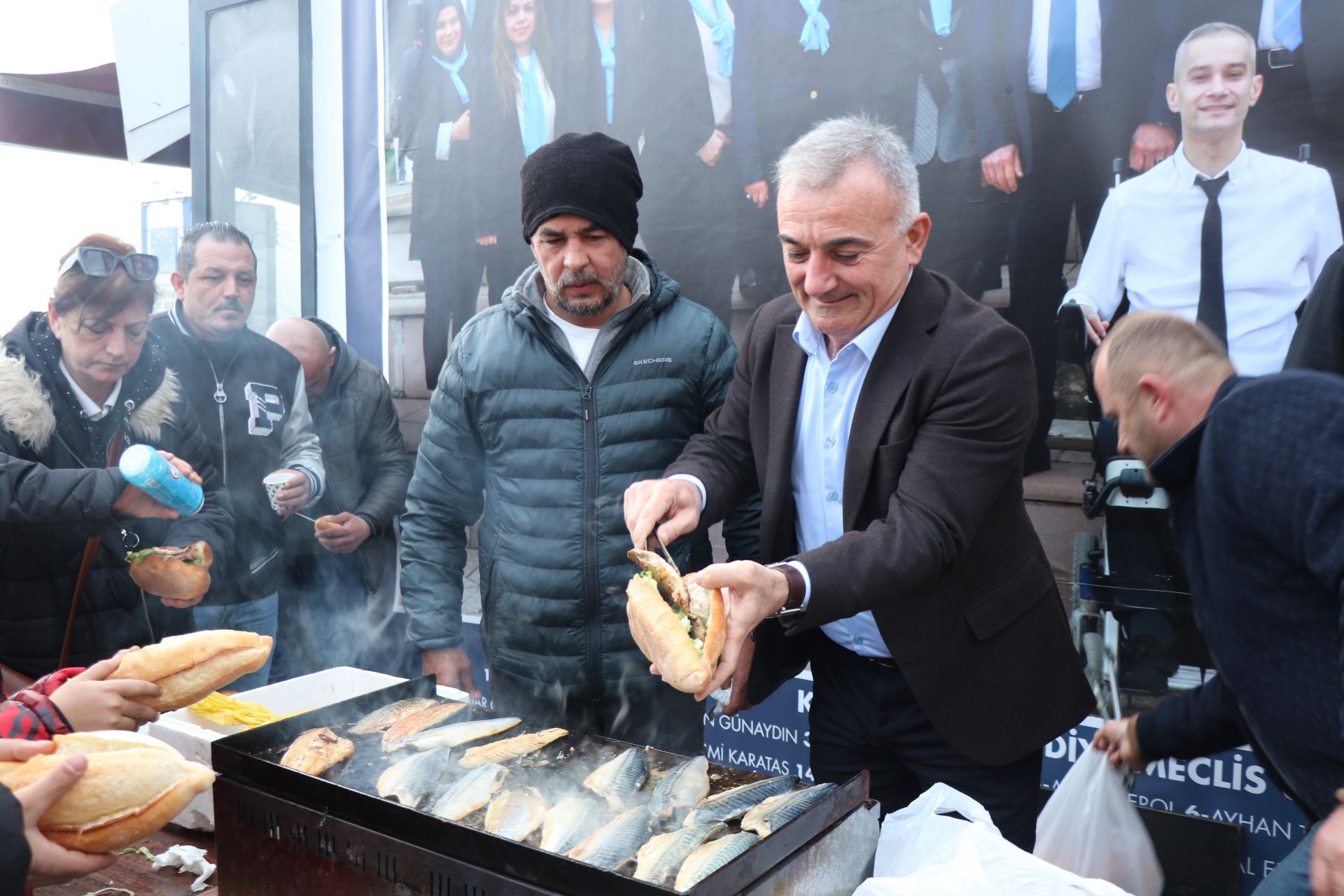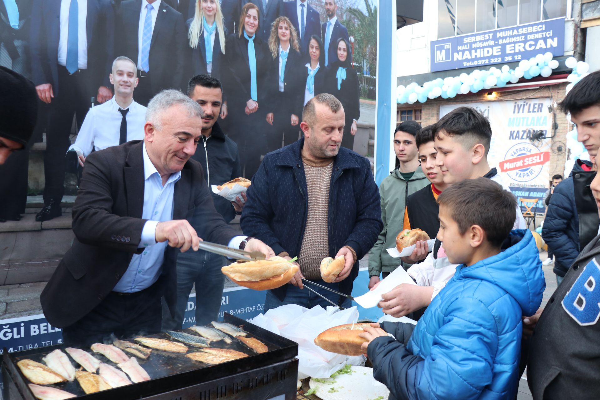 Kdz. Ereğli Belediyesi önceki dönem başkanlarından Murat Sesli, İyi parti seçim bürosuna gelen vatandaşlara ve partililere mangalda pişirdiği balıkları ekmek arasında ikram etti. Bozhane’de ki balıkçı esnafları da seçim bürosu önünde yakılan mangalda yaklaşık 300 kişiye balık ekmek ikramında bulundu.