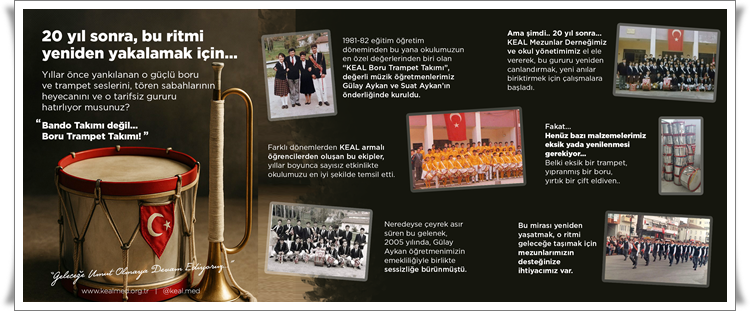 • Karadeniz Ereğli Anadolu Lisesi’nin (KEAL) köklü geleneklerinden biri olan KEAL Boru Trampet Takımı, 21 yıl aradan sonra yeniden kuruluyor. Çalışma ile öğrencilerin birlikte uyum içinde hareket etmeyi öğrenmeleri, okul kültürünü içselleştirmeleri ve KEAL arması altında yeniden sahada yer alarak o eski ritmi ve gururu geleceğe taşıması amaçlanıyor.