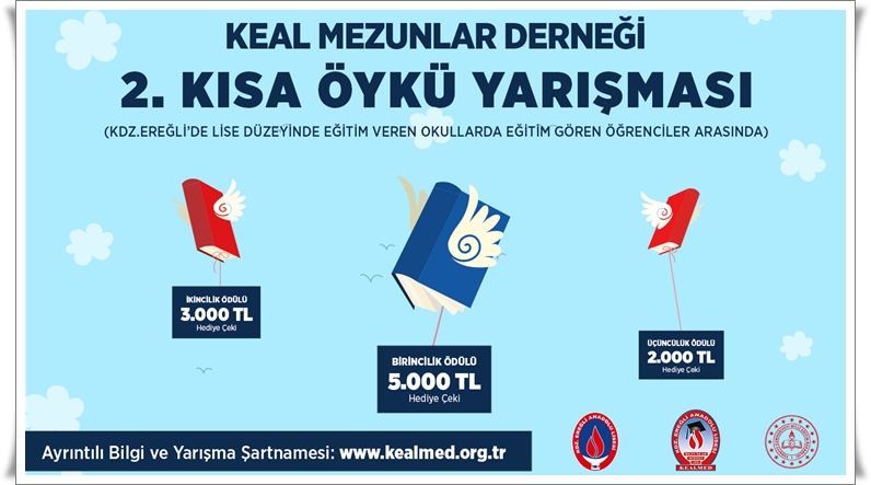 Kdz. Ereğli Anadolu Lisesi Mezunlar Derneği (KEALMED) tarafından geçtiğimiz yıl ilk kez hayata geçirilen kısa öykü yarışması; edebiyat dünyasına yeni yetenekler kazandırmak, gençlerin yazma ve üretme becerilerini desteklemek, kentin kültür ve sanat hayatına katkı sunmak amacıyla bu yıl İlçe Millî Eğitim Müdürlüğü ve Kdz. Ereğli Anadolu Lisesi işbirliğiyle düzenleniyor.