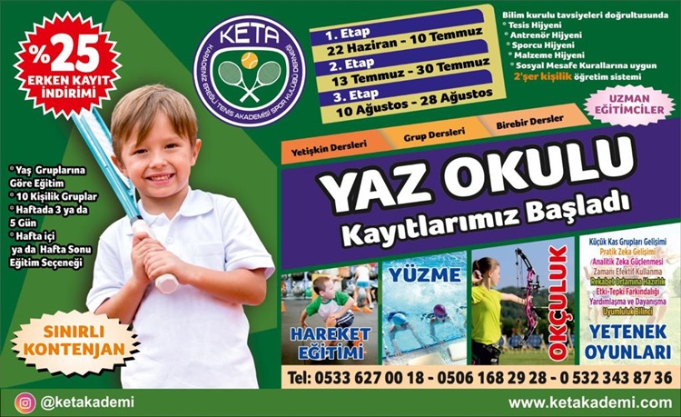 Buna göre; KETA’da Hijyen kurallarına göre hazırlanan eğitim alanlarında; 2’şer kişilik yaş gruplarına özel tenis, hareket eğitimi, okçuluk ve yüzme dersleri ile Yaz Okulu kayıtları sürpriz kampanya ile başladı. KETA’da ayrıca Kaan Ulusoy sorumluluğunda Spor Akademisi Eğitimleri ve Pandemi Kupası kapsamında Ayak Tenis Turnuvası düzenleneceği bildirildi.