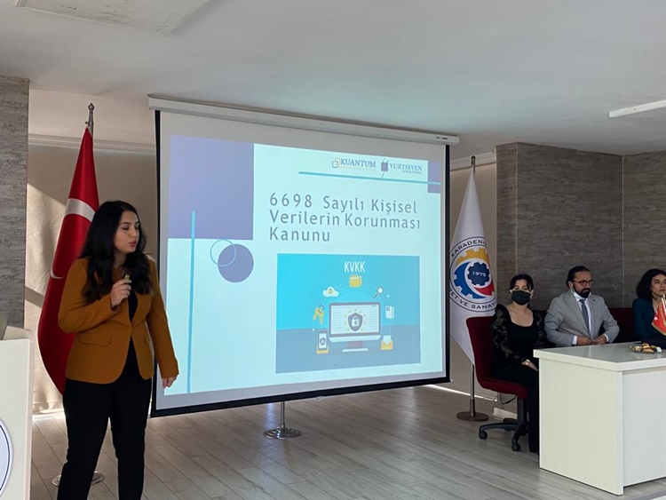 Toplantıda; Avukatlar Cansu Ergül- Beyzanur Yaman, Elektrik Elektronik Mühendisi Melisa Kaymakçı ile Kuantum Siber Güvenlik CEO’su Tuncay Karaman tarafından 6698 Sayılı Kişisel Verilerin Korunması Kanunu ve kurum ile ilgili sunumlar yapıldı. Konuşmacılar özetle işletmelerde kişisel verilerin korunmasına dair genel, idari, hukuki ve teknik tedbirlere uymanın önemine dikkat çekerek güncel gelişmeler üzerinden detaylı açıklamalar yaptılar.