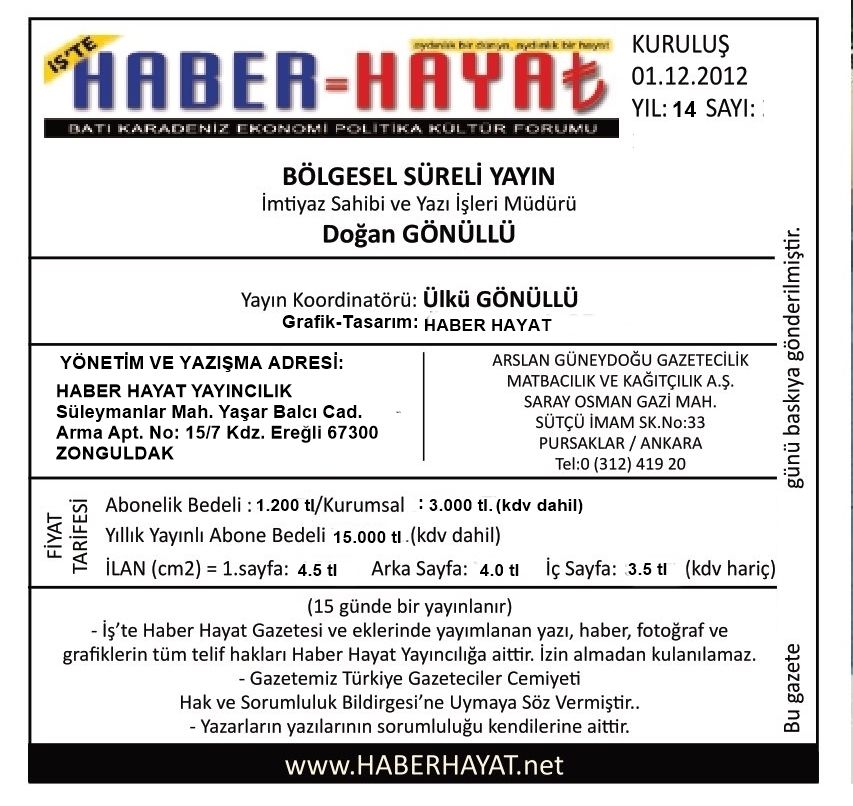 Doğan GÖNÜLLÜ. Haber Hayat Yayıncılık . Süleymanlar Mahallesi. Yaşar Balcı Caddesi. Arma Apt. B Blok No: 15/7- 67300 Kdz. Ereğli-ZONGULDAK VN: 409 006 48 33 Kdz. Ereğli