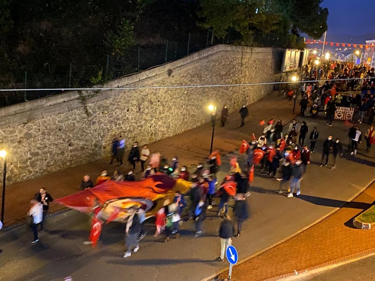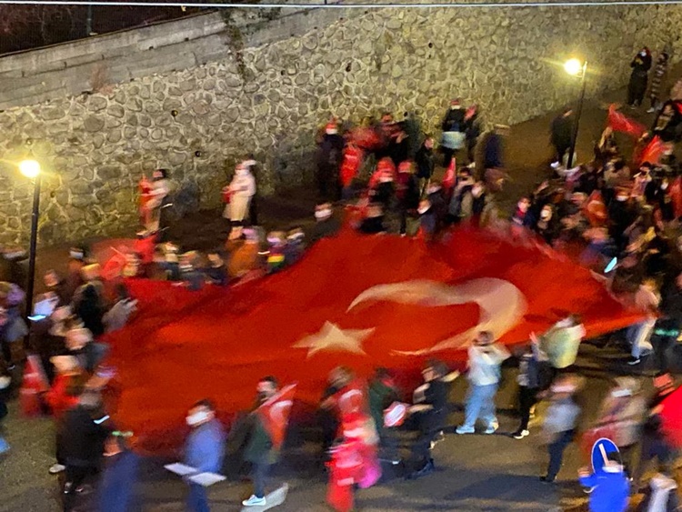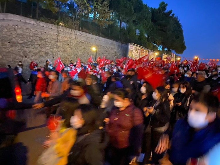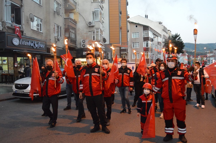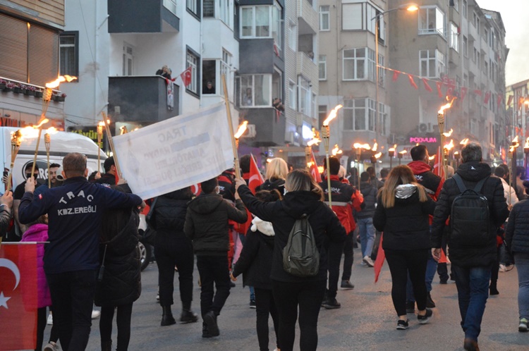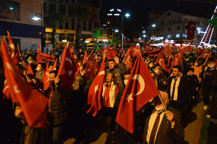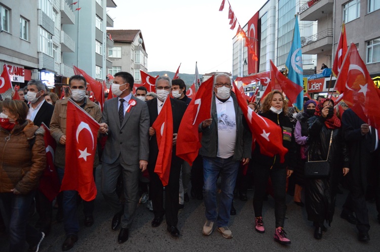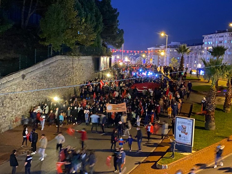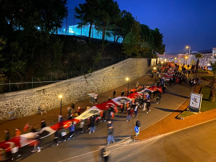 Askeri marşlar ve meşaleler eşliğinde yürüyen kalabalık uzun kortej oluştururken, gençler 100 metre uzunluğunda bayrak zinciri oluşturarak cumhuriyete sahip çıkılacağının mesajını verdiler. Karadeniz Bölge ve Garnizon Komutanlığı’nda görevli askerler ve İlçe Emniyet Müdürlüğü’nde görevli polislerin yanı sıra binlerce insanın pandemi önlemlerini zaman zaman ihmal ederek katıldığı korteje çevreden sık sık alkışlar geldi. STK’lar, spor kulüplüleri üyeleri ve vatandaşlar, fener alayında “Her şey vatan için… Ne mutlu Türküm diyene… Mustafa Kemal’in askerleriyiz…. Şehitler ölmez vatan bölünmez” gibi sloganlarla yürüyüşe eşlik ettiler. Konvoyun sonunda ise emniyet, jandarma ve belediye araçları siren ve kornalar çalarak coşkuya katkı verdiler.