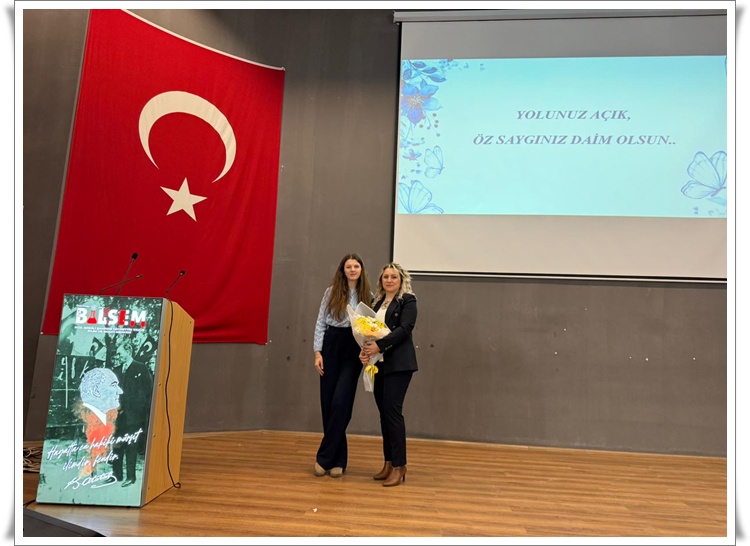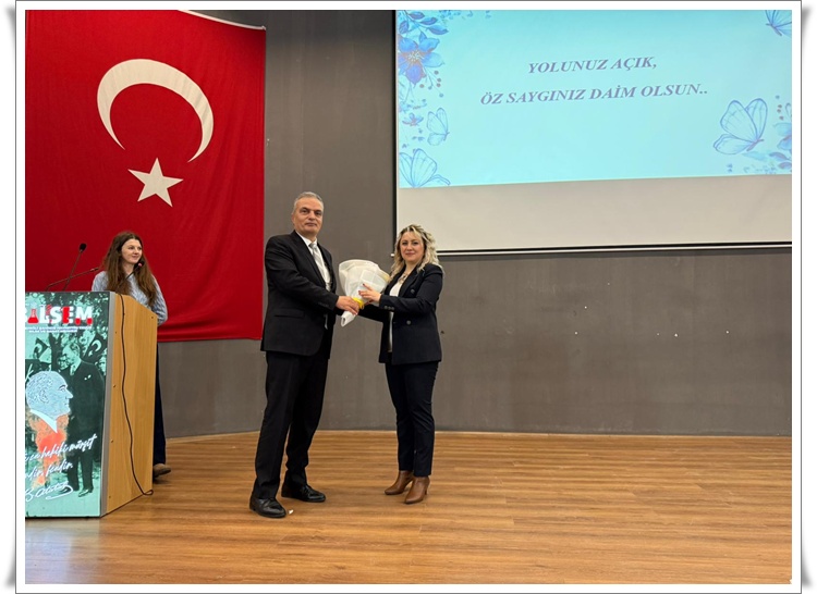 Program sonunda Okul Müdürü Uğur Yağmur tarafında konuşmacı Alev Yıldız’a çiçek ve plaket takdim edildi.