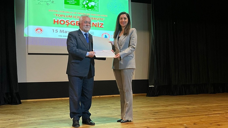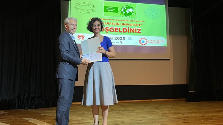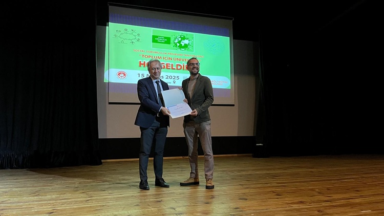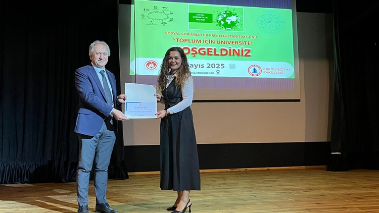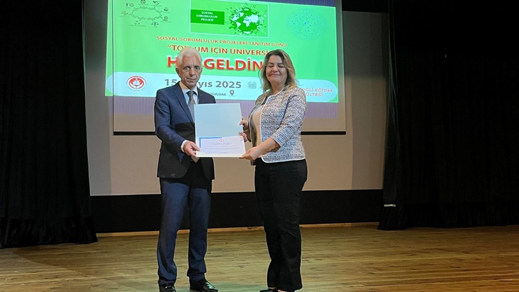 Fakültenin Sosyal Sorumluluk Koordinatörü Dr. Öğr. Üyesi Emine Kahraman ise sosyal sorumluluk projeleri faaliyetlerini ve topluma olan faydalarını özetledi. Projelerin güz döneminde “Yaşlılar-Emekliler,  Sürdürülebilir Şehirler ve Çevre, Endüstriyel ve Kültürel Miras, Dezavantajlı Gençler ve Çocuklar, Nitelikli Eğitim ve İstihdam, İyilik Yap, İyilik Bul” temalarında; Bahar Döneminde ise, ana tema olarak “Aile” başlığı belirlendiğini bildiren Kahraman, “Gerçekleştirilen sosyal sorumluluk projeleriyle, toplumun çok farklı kesimlerine ulaşmak hedeflenmiştir. Projelerimizin hedef kitlesi yalnızca öğrencilerle sınırlı kalmayarak; aileler, çocuklar, okul öncesi dönemden ilkokul ve liseye kadar her yaş grubundan öğrenciler, öğretmenler, özel gereksinimli bireyler, huzurevi sakinleri ve toplumun farklı kesimleri bu çalışmaların odağında yer almıştır. Ayrıca, velilerle birlikte yürütülen etkinlikler sayesinde aile içi iletişim ve iş birliği güçlendirilirken, toplumsal dayanışma ve farkındalık da artırılmıştır. Böylece, projelerde hem çocukların hem de yetişkinlerin hayatına dokunulmuştur.” dedi. Kahraman konuşmasının son bölümünde tüm paydaşlara teşekkür ederek başarılı öğrencileri kutladı.