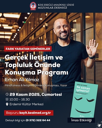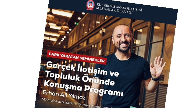 Dernek yönetiminden verilen bilgiye göre; bu yıl ikincisi düzenlenecek program kapsamında Kdz.Ereğli Anadolu Lisesi 1998 mezunlarından, Mindfulness & İletişim Eğitmeni, Konuşmacı ve Yazar Erhan Ali Yılmaz; sadece öğretmenler ve öğretmen adaylarına özel ve ücretsiz olarak “Gerçek İletişim ve Topluluk Önünde Konuşma Programı” ile bir araya gelecek.