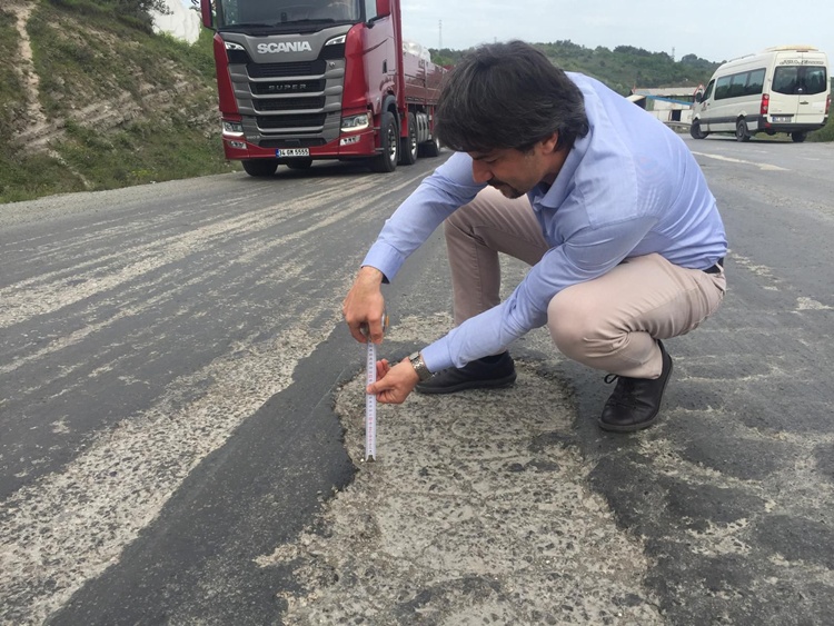 Bölgedeki yolların adeta köstebek yuvasına döndüğünü belirten ve OSB yolunda elinde metre ile çukurların ölçümünü yapan Ertuğrul, “Vergi memurlarını buradan geçirecek yol yok” diyerek iktidara yüklendi. Ağır tonajlı sanayi araçlarının, aynı zamanda okulun da kullandığı bir yol olması nedeniyle öğrenci taşıyan okul servislerinin de zorlandığı, zaman zaman kazalara yol açan bozuk yolların yıllardır çözülemediğini hatırlatan CHP’li ErtuğruL, “Denetim değil, önce altyapı lazım. Bu haliyle Ereğli OSB’ye ne vergi memuru gelebilir ne başka araç girer. Buradaki bu yol bozukluğu uzun süreden beri var olan bir sorun. Bu yol hem Alaplı Kdz Ereğli OSB’nin hem de Bahçeşehir Okulu’nun kullandığı ortak bir yol. Biz bu sorunu sürekli gündeme taşıyoruz. Meclis gündemine de taşıdık. Ulaştırma ve Altyapı Bakanlığı’na da soru önergesi verdik ancak cevaplanmadı. Organize sanayiler, o kentin ülkesinin her iline ve dünyaya açılan kapısıdır. Kdz. Ereğli’de dünyaya açılan kapımızın yolunu gelin de görün. Kdz. Ereğli Organize Sanayi Bölgesi’ne ulaşım sağlayan ana yol güzergahındaki derin çukurlar yolu çile yolu haline getirdi.” dedi.