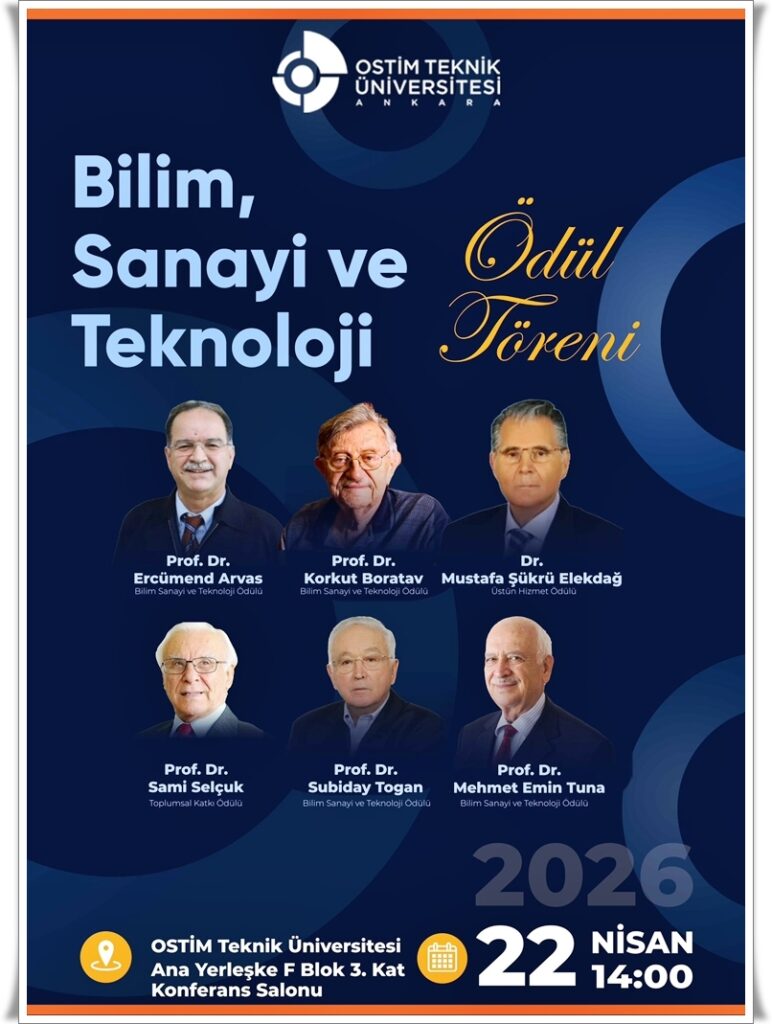 Bilim ve sanayi dünyasının seçkin isimlerini bir araya getirecek tören, 22 Nisan 2026 Çarşamba günü saat 14.00’te OSTİM Teknik Üniversitesi Ana Yerleşke F Blok 3. Kat Konferans Salonu’nda gerçekleştirilecek.