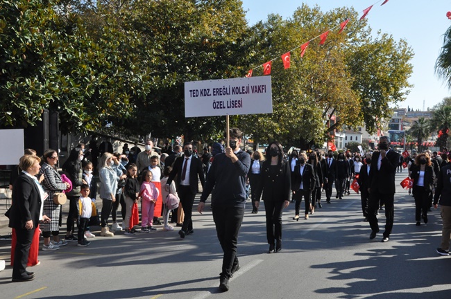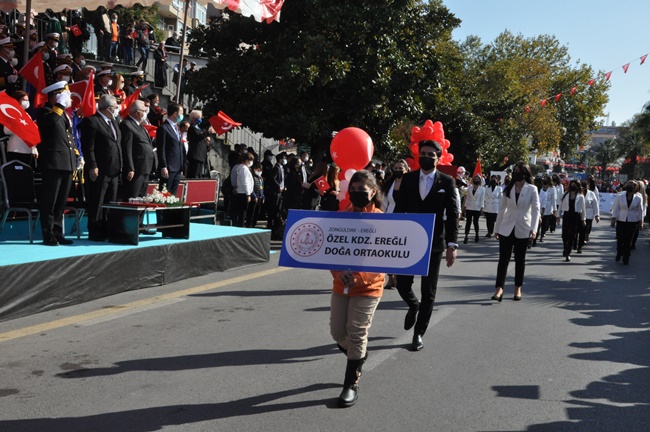 Sunumları Sultan Çivici ve Erkan Kılıçarslan tarafından yapılan tören, okullardaki yarışmalarda ve spor karşılaşmalarında derece alanlara protokol tarafından plaket takdim edilmesi ile devam etti. Doğa Koleji Armoni orkestrası eşliğinde gerçekleşen geçit töreninde ise okulların öğretmen ve öğrencileri, resmi kurumlar, Erdemir ekibi, STK ekipleri ve halk geçit yaparak protokolü selamladı. Geçit töreni pandemi nedeni ile uzun süredir yaşanamayan coşkulu anlara sahne olurken katılımcılar tarafından yaşanan milli duyguların ellerde bayraklarla yükselişi ve gurur görülmeye değerdi. Kdz. Ereğli Kaymakamlığı tarafından hazırlanan Cumhuriyet Bayramı gündüz programı, Cumhuriyetin kuruluşunun 98. yılına ithafen 98 adet balonun protokol tarafından göklere uçurulması ile son buldu.