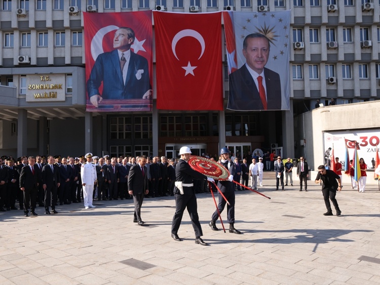 Kutlamalar, Atatürk Anıtı’na çelenk sunumuyla başladı. Zonguldak Valisi Osman Hacıbektaşoğlu, Belediye Başkanı Tahsin Erdem ve Albay Mustafa Güzel, anıta çelenk sundu. Ardından aziz şehitler anısına saygı duruşunda bulunuldu ve İstiklal Marşı okundu.