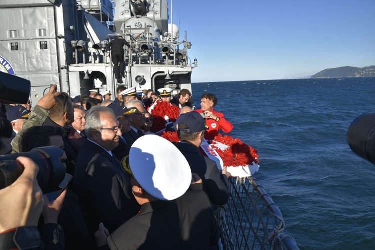 “Bezm-i Alem”, “Bahr-i Ahmer” ve “Mithat Paşa” gemilerinin mürettebatı için protokol üyeleri tarafından Deniz Kuvvetleri’ne bağlı TCG Yıldırım Fırkateyni ile olayın yaşandığı bölgede mavi sulara çelenk bırakıldı.